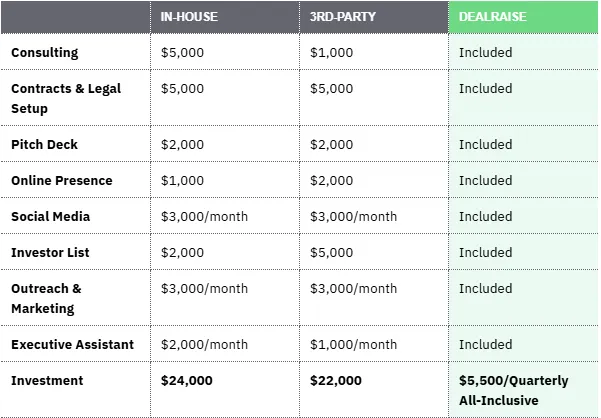 Raising capital takes more than just investor intros, you need a team handling every part of the process. With DealRaise, you get a dedicated, fractionalized team working seamlessly to execute your campaign.